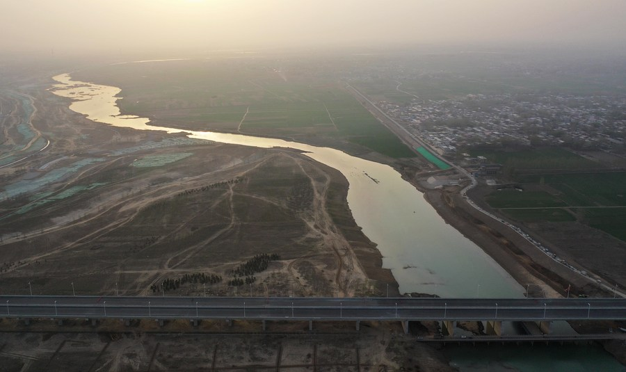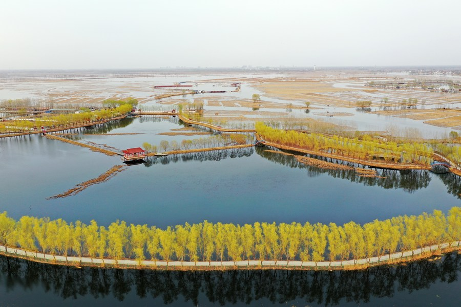 Aerial photo taken on March 16, 2021 shows the scenery of Baiyangdian Lake in Xiong'an New Area, north China's Hebei Province. The Xiong'an New Area has begun its large-scale development and construction, with more than 100,000 constructors working on over 120 major projects in the area. The "city of the future" is greeting a brand new look day by day. (Xinhua/Mu Yu)