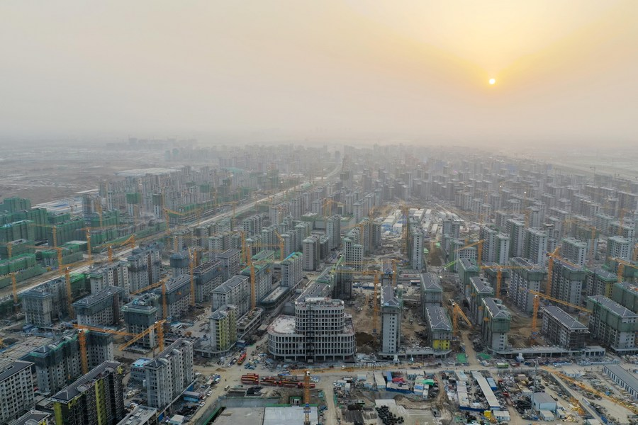 Aerial photo taken on March 31, 2021 shows the construction site of Rongdong area in Xiong'an New Area, north China's Hebei Province. The Xiong'an new area has begun its large-scale development and construction, with more than 100,000 constructors working on over 120 major projects in the area. The "city of the future" is greeting a brand new look day by day. (Xinhua/Xing Guangli)