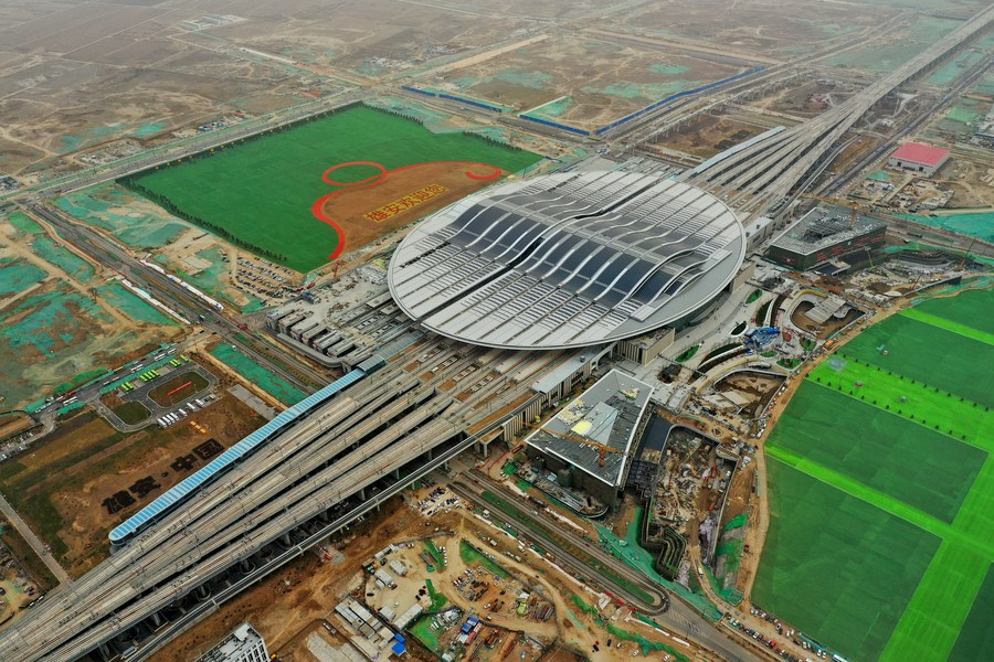 Aerial photo taken on March 17, 2021 shows the Xiong'an Railway Station of the Beijing-Xiong'an intercity railway in Xiong'an New Area, north China's Hebei Province. The Xiong'an new area has begun its large-scale development and construction, with more than 100,000 constructors working on over 120 major projects in the area. The "city of the future" is greeting a brand new look day by day. (Xinhua/Mu Yu)