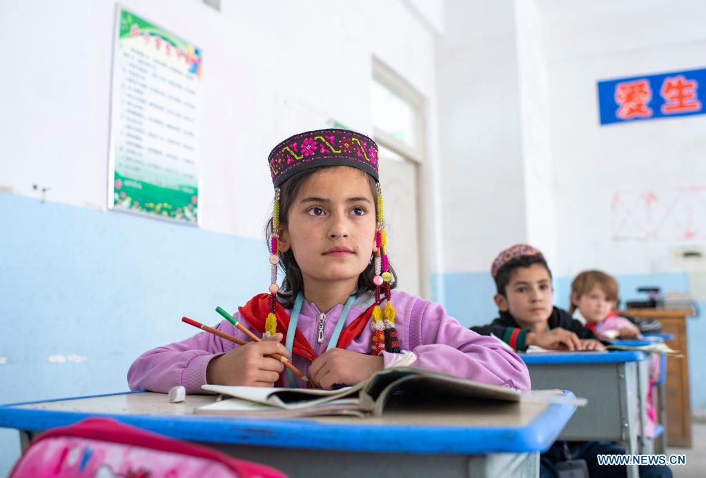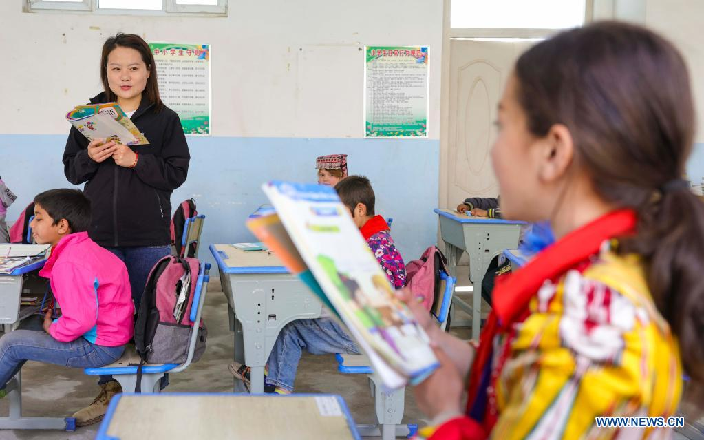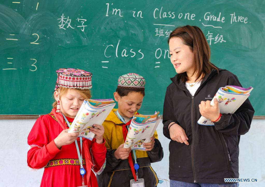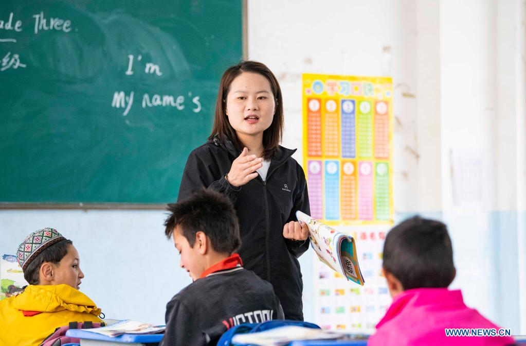 Pupils study English at a primary school in Alimalik Village of Akto County, northwest China's Xinjiang Uygur Autonomous Region, May 11, 2021. Chen Fangying, a 24-year-old village teacher, is from southwest China's Guizhou Province. When she graduated from college two years ago, she chose to become a teacher in Xinjiang. The primary school where Chen teaches is located in the Kunlun Mountains, more than 1,800 kilometers away from Xinjiang's capital city Urumqi. "For me, this is the life I should live in my twenties," said Chen. Chen Fangying has more than ten classes every week, including Chinese, English and Music. In addition, she is also required to work with other teachers to develop solutions to help local teachers improve their capacity. Meanwhile, Chen often communicates with parents during home visits to help improve learning environment. Chen values the studies of 14 students in third grade most. According to local education policy, starting from the fourth grade, students are required to go to the County, 380 kilometers away from the village, to enjoy higher quality education. Chen is full of expectations for these students who will enter the fourth grade this September. She insists they should read more books so that they can learn more about the world outside the mountains. In her daily teaching, she focuses on activating the classroom atmosphere through novel teaching methods, broadening students' horizons and helping them build up confidence. In recent years, more and more tourists have come to the village. In the beginning, the students were shy about talking to tourists. However, Chen always encourages them to express their ideas with confidence. Now, they are much more outgoing. Chen is genuinely happy with the growth of her students. It's meaningful for Chen that the students would remember she had taught them after they walked out of the mountains and moved to the cities. (Xinhua/Hu Huhu)