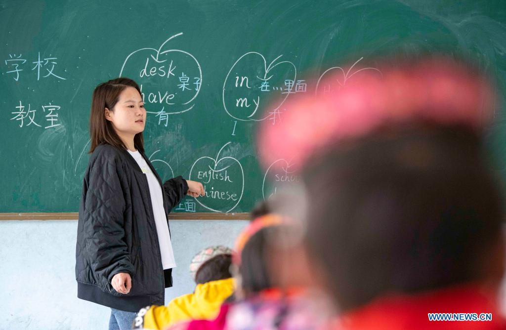 Chen Fangying teaches English at Alimalik Village of Akto County, northwest China's Xinjiang Uygur Autonomous Region, May 11, 2021. Chen Fangying, a 24-year-old village teacher, is from southwest China's Guizhou Province. When she graduated from college two years ago, she chose to become a teacher in Xinjiang. The primary school where Chen teaches is located in the Kunlun Mountains, more than 1,800 kilometers away from Xinjiang's capital city Urumqi. "For me, this is the life I should live in my twenties," said Chen. Chen Fangying has more than ten classes every week, including Chinese, English and Music. In addition, she is also required to work with other teachers to develop solutions to help local teachers improve their capacity. Meanwhile, Chen often communicates with parents during home visits to help improve learning environment. Chen values the studies of 14 students in third grade most. According to local education policy, starting from the fourth grade, students are required to go to the County, 380 kilometers away from the village, to enjoy higher quality education. Chen is full of expectations for these students who will enter the fourth grade this September. She insists they should read more books so that they can learn more about the world outside the mountains. In her daily teaching, she focuses on activating the classroom atmosphere through novel teaching methods, broadening students' horizons and helping them build up confidence. In recent years, more and more tourists have come to the village. In the beginning, the students were shy about talking to tourists. However, Chen always encourages them to express their ideas with confidence. Now, they are much more outgoing. Chen is genuinely happy with the growth of her students. It's meaningful for Chen that the students would remember she had taught them after they walked out of the mountains and moved to the cities. (Xinhua/Hu Huhu)