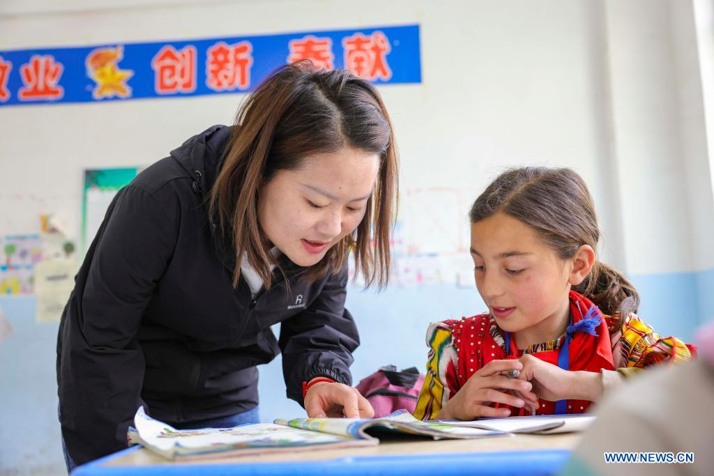 Chen Fangying tutors a student at Alimalik Village of Akto County, northwest China's Xinjiang Uygur Autonomous Region, May 12, 2021. Chen Fangying, a 24-year-old village teacher, is from southwest China's Guizhou Province. When she graduated from college two years ago, she chose to become a teacher in Xinjiang. The primary school where Chen teaches is located in the Kunlun Mountains, more than 1,800 kilometers away from Xinjiang's capital city Urumqi. "For me, this is the life I should live in my twenties," said Chen. Chen Fangying has more than ten classes every week, including Chinese, English and Music. In addition, she is also required to work with other teachers to develop solutions to help local teachers improve their capacity. Meanwhile, Chen often communicates with parents during home visits to help improve learning environment. Chen values the studies of 14 students in third grade most. According to local education policy, starting from the fourth grade, students are required to go to the County, 380 kilometers away from the village, to enjoy higher quality education. Chen is full of expectations for these students who will enter the fourth grade this September. She insists they should read more books so that they can learn more about the world outside the mountains. In her daily teaching, she focuses on activating the classroom atmosphere through novel teaching methods, broadening students' horizons and helping them build up confidence. In recent years, more and more tourists have come to the village. In the beginning, the students were shy about talking to tourists. However, Chen always encourages them to express their ideas with confidence. Now, they are much more outgoing. Chen is genuinely happy with the growth of her students. It's meaningful for Chen that the students would remember she had taught them after they walked out of the mountains and moved to the cities. (Xinhua/Hu Huhu)