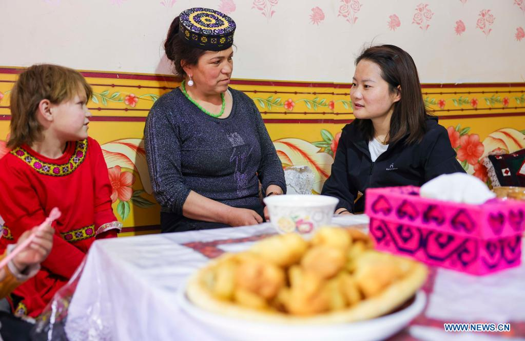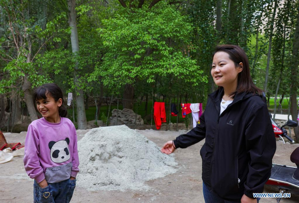 Chen Fangying (R) pays a home visit at Alimalik Village of Akto County, northwest China's Xinjiang Uygur Autonomous Region, May 12, 2021. Chen Fangying, a 24-year-old village teacher, is from southwest China's Guizhou Province. When she graduated from college two years ago, she chose to become a teacher in Xinjiang. The primary school where Chen teaches is located in the Kunlun Mountains, more than 1,800 kilometers away from Xinjiang's capital city Urumqi. "For me, this is the life I should live in my twenties," said Chen. Chen Fangying has more than ten classes every week, including Chinese, English and Music. In addition, she is also required to work with other teachers to develop solutions to help local teachers improve their capacity. Meanwhile, Chen often communicates with parents during home visits to help improve learning environment. Chen values the studies of 14 students in third grade most. According to local education policy, starting from the fourth grade, students are required to go to the County, 380 kilometers away from the village, to enjoy higher quality education. Chen is full of expectations for these students who will enter the fourth grade this September. She insists they should read more books so that they can learn more about the world outside the mountains. In her daily teaching, she focuses on activating the classroom atmosphere through novel teaching methods, broadening students' horizons and helping them build up confidence. In recent years, more and more tourists have come to the village. In the beginning, the students were shy about talking to tourists. However, Chen always encourages them to express their ideas with confidence. Now, they are much more outgoing. Chen is genuinely happy with the growth of her students. It's meaningful for Chen that the students would remember she had taught them after they walked out of the mountains and moved to the cities. (Xinhua/Hu Huhu)