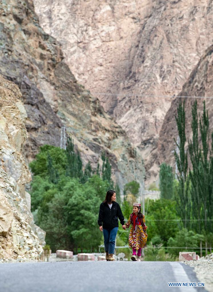 Chen Fangying escorts a student home at Alimalik Village of Akto County, northwest China's Xinjiang Uygur Autonomous Region, May 12, 2021. Chen Fangying, a 24-year-old village teacher, is from southwest China's Guizhou Province. When she graduated from college two years ago, she chose to become a teacher in Xinjiang. The primary school where Chen teaches is located in the Kunlun Mountains, more than 1,800 kilometers away from Xinjiang's capital city Urumqi. "For me, this is the life I should live in my twenties," said Chen. Chen Fangying has more than ten classes every week, including Chinese, English and Music. In addition, she is also required to work with other teachers to develop solutions to help local teachers improve their capacity. Meanwhile, Chen often communicates with parents during home visits to help improve learning environment. Chen values the studies of 14 students in third grade most. According to local education policy, starting from the fourth grade, students are required to go to the County, 380 kilometers away from the village, to enjoy higher quality education. Chen is full of expectations for these students who will enter the fourth grade this September. She insists they should read more books so that they can learn more about the world outside the mountains. In her daily teaching, she focuses on activating the classroom atmosphere through novel teaching methods, broadening students' horizons and helping them build up confidence. In recent years, more and more tourists have come to the village. In the beginning, the students were shy about talking to tourists. However, Chen always encourages them to express their ideas with confidence. Now, they are much more outgoing. Chen is genuinely happy with the growth of her students. It's meaningful for Chen that the students would remember she had taught them after they walked out of the mountains and moved to the cities. (Xinhua/Hu Huhu)