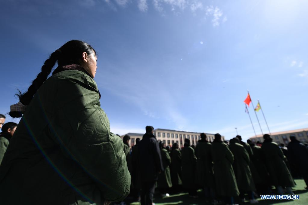 Curmey Drolma (L) and her classmates take part in a flag-raising ceremony at their school in Maduo County of Golog Tibetan Autonomous Prefecture, northwest China's Qinghai Province, May 24, 2021. Primary and secondary schools in the quake-hit areas of Maduo County resumed classes on Monday. Curmey Drolma, 16, student of a boarding secondary school in Maduo County, had classes inside tents as temporary classrooms with more than 870 schoolmates on Monday. (Xinhua/Zhang Long)