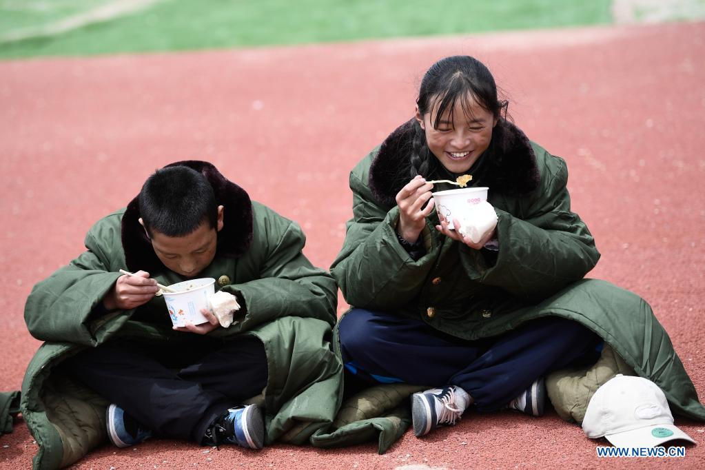 Curmey Drolma (R) and her classmate have lunch at school in Maduo County of Golog Tibetan Autonomous Prefecture, northwest China's Qinghai Province, May 24, 2021. Primary and secondary schools in the quake-hit areas of Maduo County resumed classes on Monday. Curmey Drolma, 16, student of a boarding secondary school in Maduo County, had classes inside tents as temporary classrooms with more than 870 schoolmates on Monday. (Xinhua/Zhang Long)