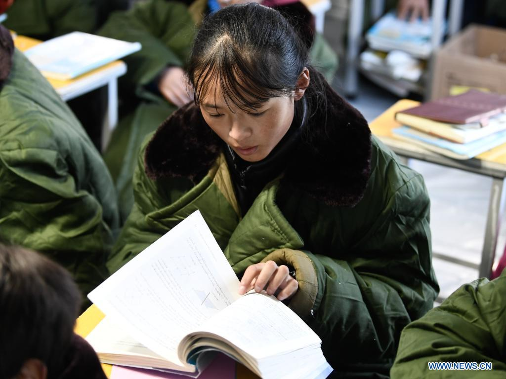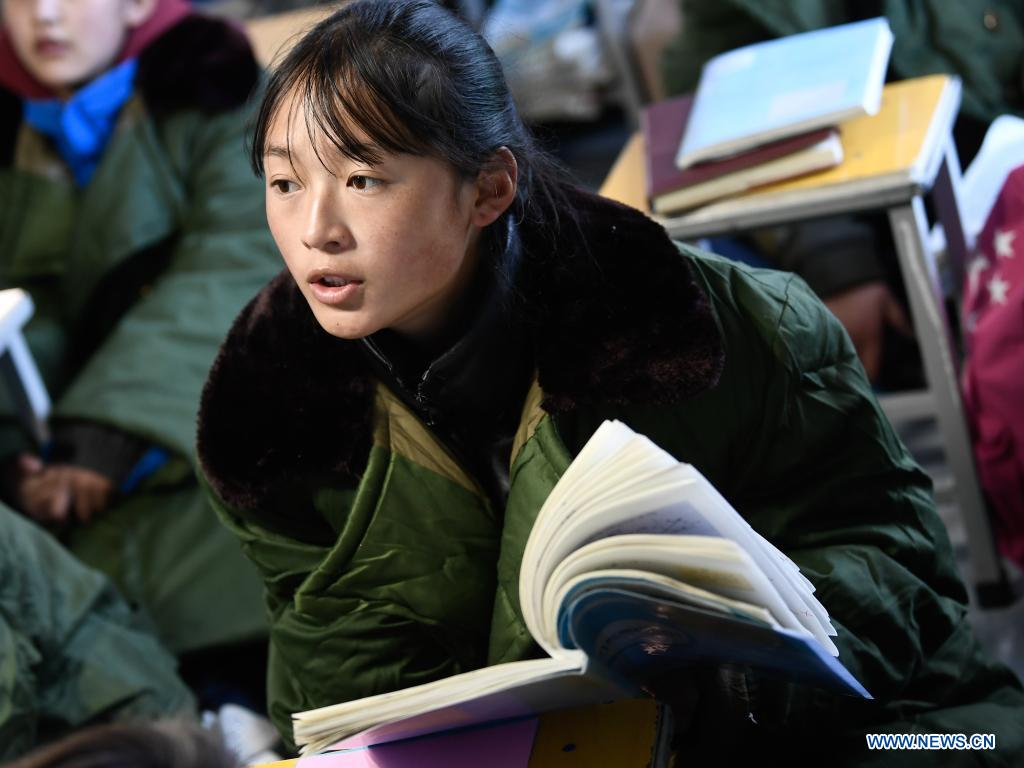 Curmey Drolma reads during a class inside a tent in Maduo County of Golog Tibetan Autonomous Prefecture, northwest China's Qinghai Province, May 24, 2021. Primary and secondary schools in the quake-hit areas of Maduo County resumed classes on Monday. Curmey Drolma, 16, student of a boarding secondary school in Maduo County, had classes inside tents as temporary classrooms with more than 870 schoolmates on Monday. (Xinhua/Zhang Long)