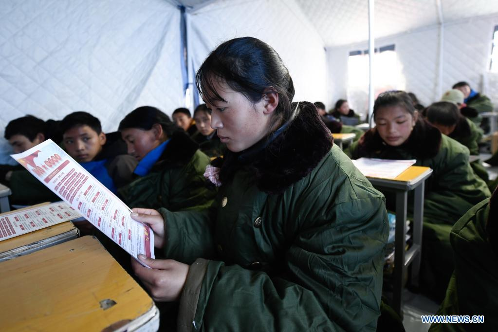 Curmey Drolma (front) and her classmates learn the knowledge on disaster prevention inside a tent in Maduo County of Golog Tibetan Autonomous Prefecture, northwest China's Qinghai Province, May 24, 2021. Primary and secondary schools in the quake-hit areas of Maduo County resumed classes on Monday. Curmey Drolma, 16, student of a boarding secondary school in Maduo County, had classes inside tents as temporary classrooms with more than 870 schoolmates on Monday. (Xinhua/Zhang Long)
