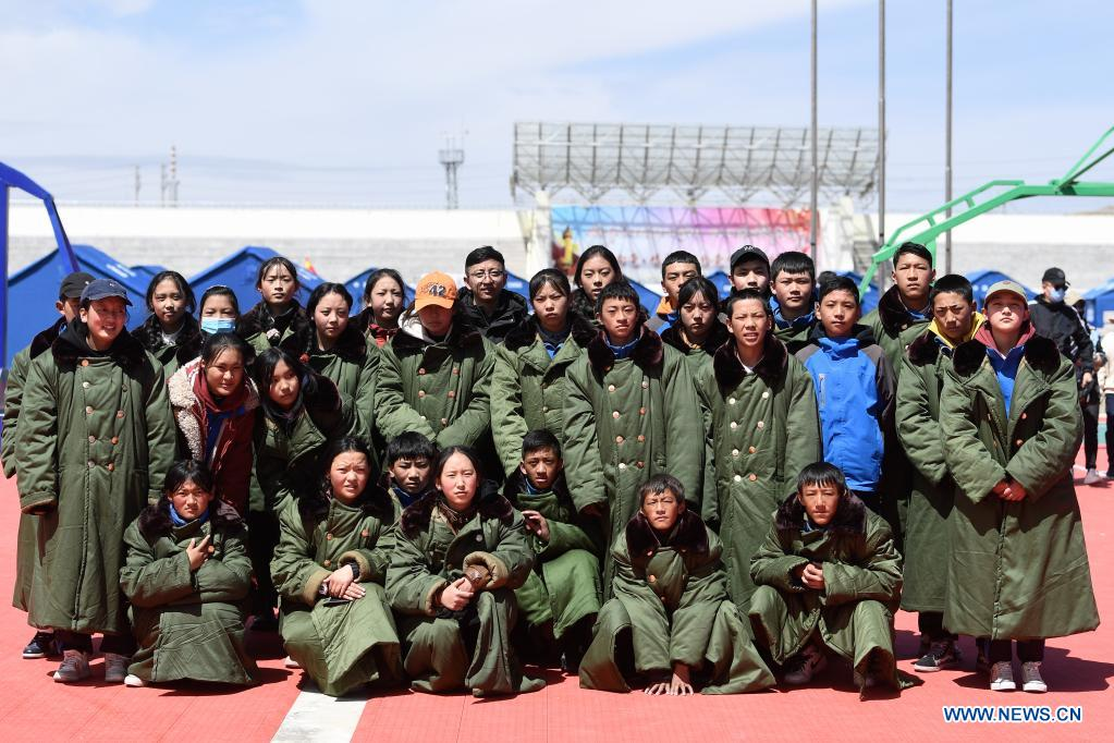 Curmey Drolma and her classmates pose for a group photo at their school in Maduo County of Golog Tibetan Autonomous Prefecture, northwest China's Qinghai Province, May 24, 2021. Primary and secondary schools in the quake-hit areas of Maduo County resumed classes on Monday. Curmey Drolma, 16, student of a boarding secondary school in Maduo County, had classes inside tents as temporary classrooms with more than 870 schoolmates on Monday. (Xinhua/Zhang Long)