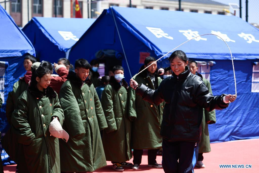 Curmey Drolma skips a rope during a break at school in Maduo County of Golog Tibetan Autonomous Prefecture, northwest China's Qinghai Province, May 24, 2021. Primary and secondary schools in the quake-hit areas of Maduo County resumed classes on Monday. Curmey Drolma, 16, student of a boarding secondary school in Maduo County, had classes inside tents as temporary classrooms with more than 870 schoolmates on Monday. (Xinhua/Zhang Long)