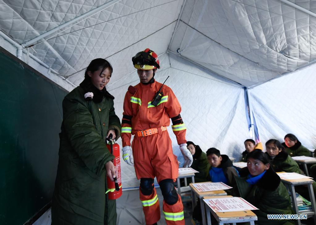 Curmey Drolma tries to use a fire extinguisher under the guidance of a firefighter inside a tent in Maduo County of Golog Tibetan Autonomous Prefecture, northwest China's Qinghai Province, May 24, 2021. Primary and secondary schools in the quake-hit areas of Maduo County resumed classes on Monday. Curmey Drolma, 16, student of a boarding secondary school in Maduo County, had classes inside tents as temporary classrooms with more than 870 schoolmates on Monday. (Xinhua/Zhang Long)