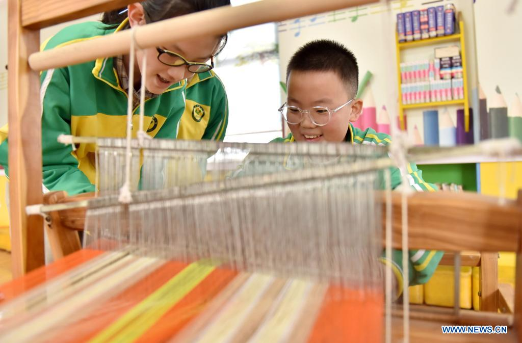Students try to use the traditional waving loom in Weixian County, north China's Hebei Province, April 7, 2021. Schools in Weixian County have introduced intangible cultural heritages to class to raise students' interests in traditional arts and skills. (Xinhua/Zhu Xudong)