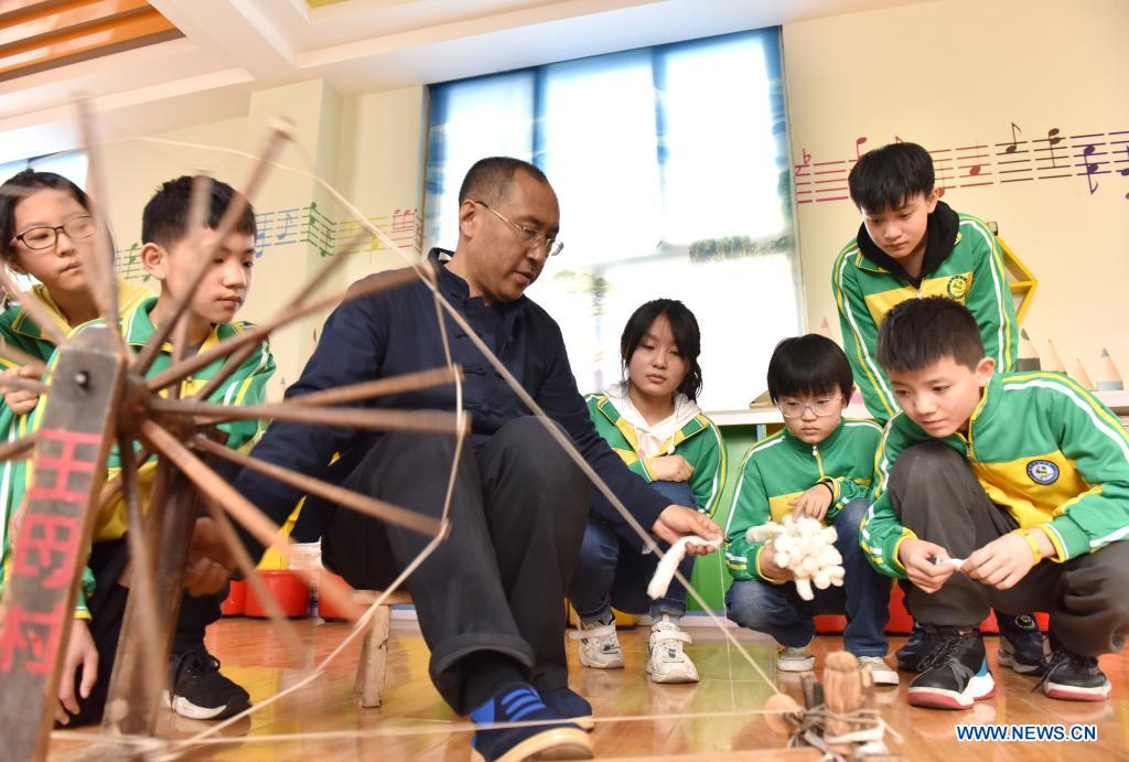 Gao Qinghai, an inheritor of the intangible cultural heritage, shows traditional textile skills to students in Weixian County, north China's Hebei Province, April 7, 2021. Schools in Weixian County have introduced intangible cultural heritages to class to raise students' interests in traditional arts and skills. (Xinhua/Zhu Xudong)