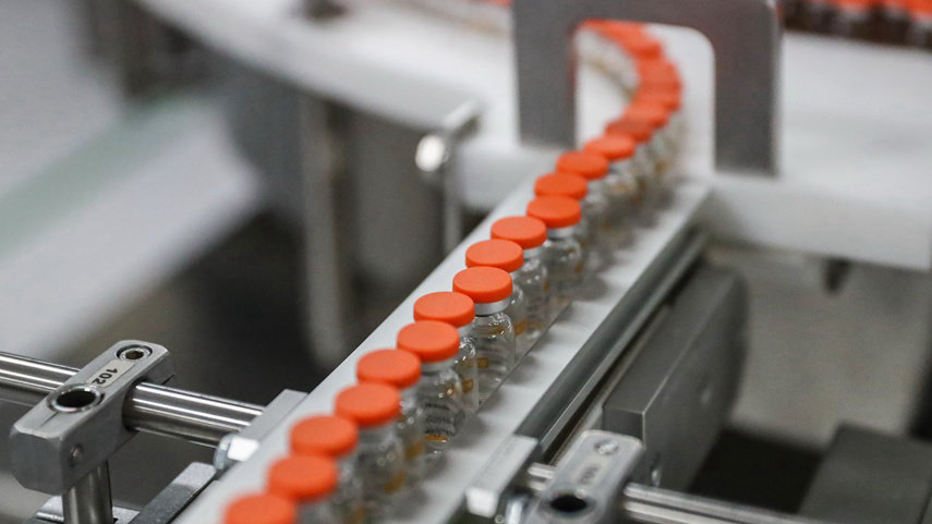 这是1月6日拍摄的科兴中维新冠病毒灭活疫苗克尔来福的西林瓶装包装线。