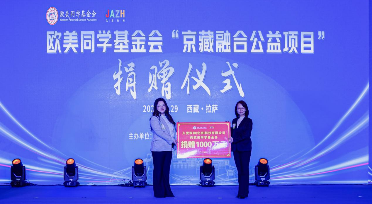 仪式现场,久爱致和(北京)科技有限公司董事长、总经理王妍代表公司捐赠人民币1000万元,支持“京藏融合公益项目”落地实施,欧美同学基金会副秘书长王穗接受捐赠。该公司还将发挥其在数字技术、电商运营及人才培养领域的专业优势,为藏区大学生提供数字化技能培训课程,依托公司供应链与平台资源,为西藏本土特色产品搭建线上推广渠道,助力乡村振兴与产业发展,让科技力量成为连接京藏、赋能西藏的重要纽带。